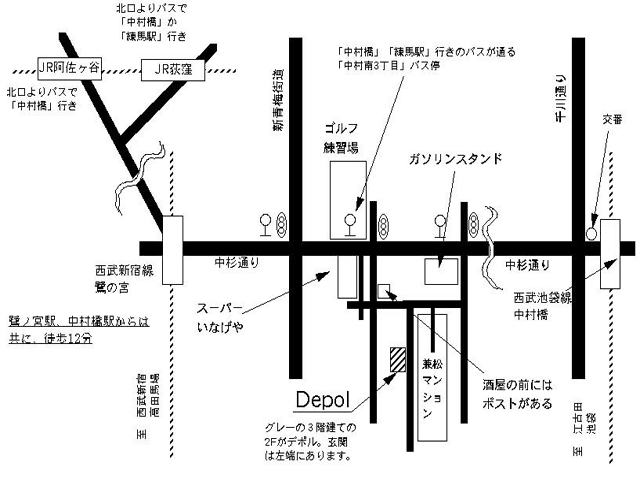 高田馬場から、西武新宿線、準急・急行で一つ目が鷺の宮(所要時間8分)。改札を出て右方向の階段を降りると中杉通りにでる。向かって右方向(中村橋方向)に歩く。新青梅街道を通り過ぎて、さらに少しいくと、右手にスーパーいなげや見える。次の信号を右折、左手にあるすぐの酒屋で左折、次の角でまた右折。50Mほどの右手3F建てグレーの建物2Fがデポル。鷺の宮から徒歩12分。